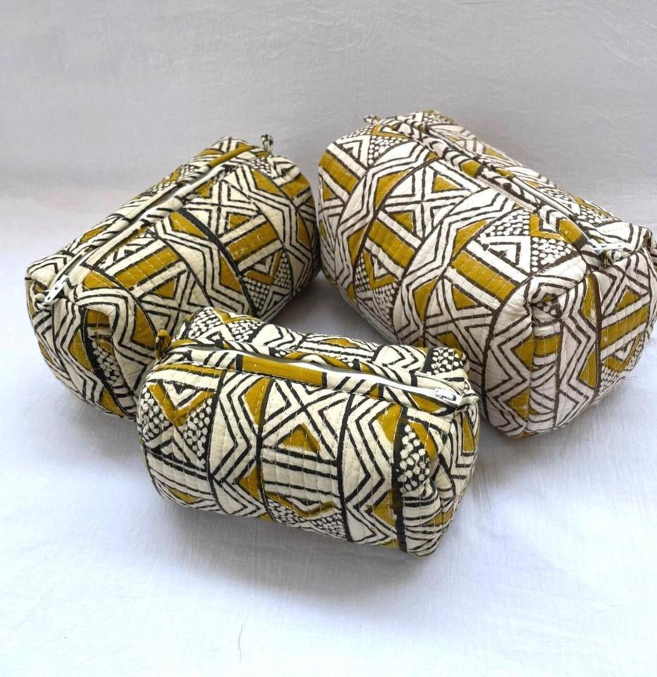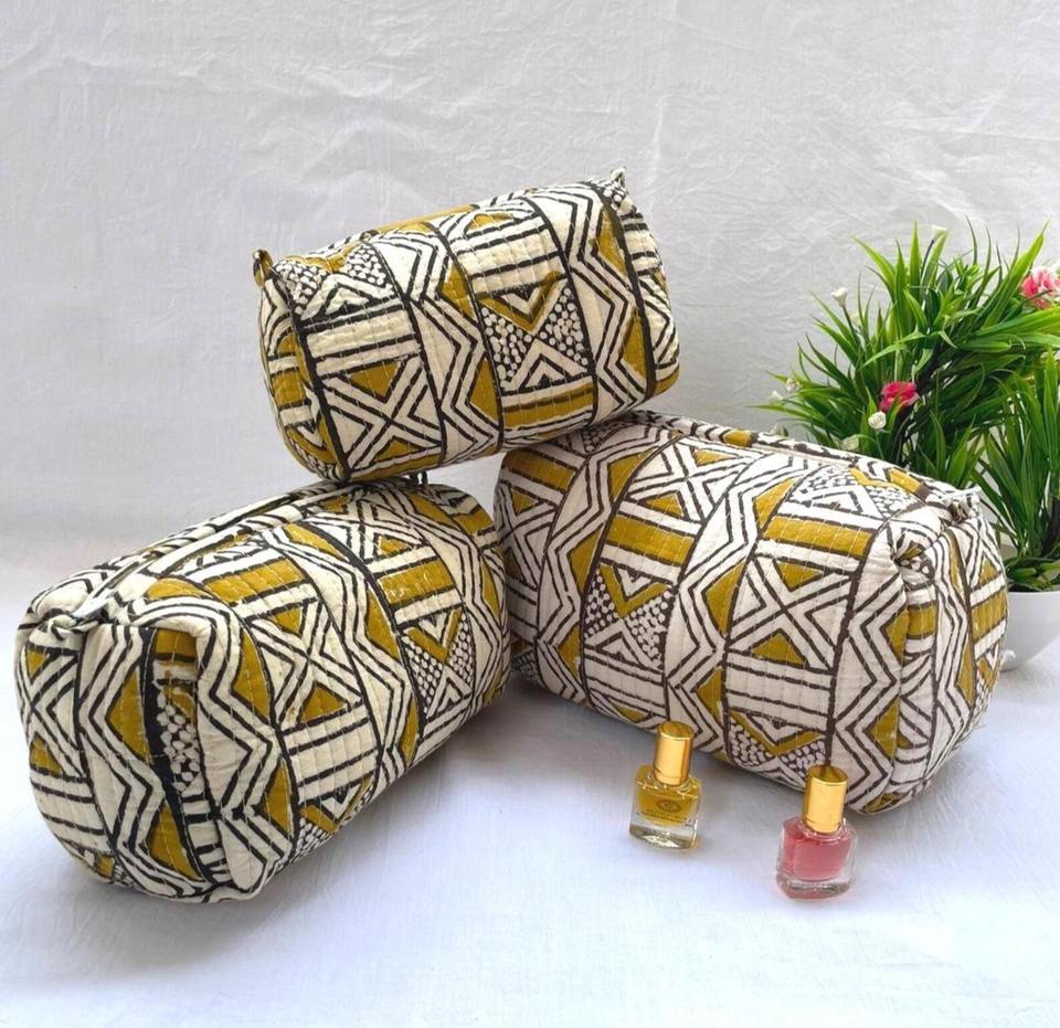 Bagru Print Eco-Friendly Water Resistant Cotton Case Zipper Closure Quilted Vintage Travel Pouches Large Capacity Makeup Storage