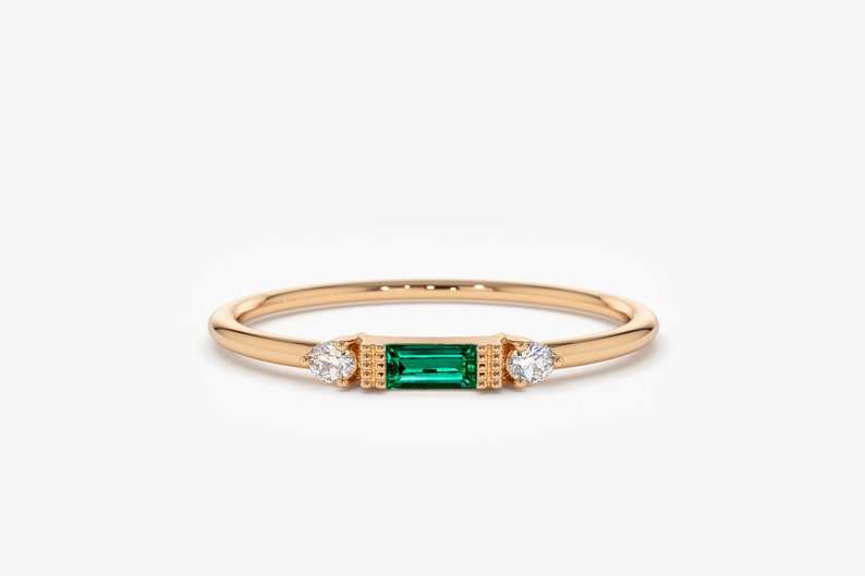 Baguette Emerald Ring 14k Solid Gold Minimalist Engagement Ring Cubic Zirconia Diamond Delicate Promise Ring for Everyday Wear