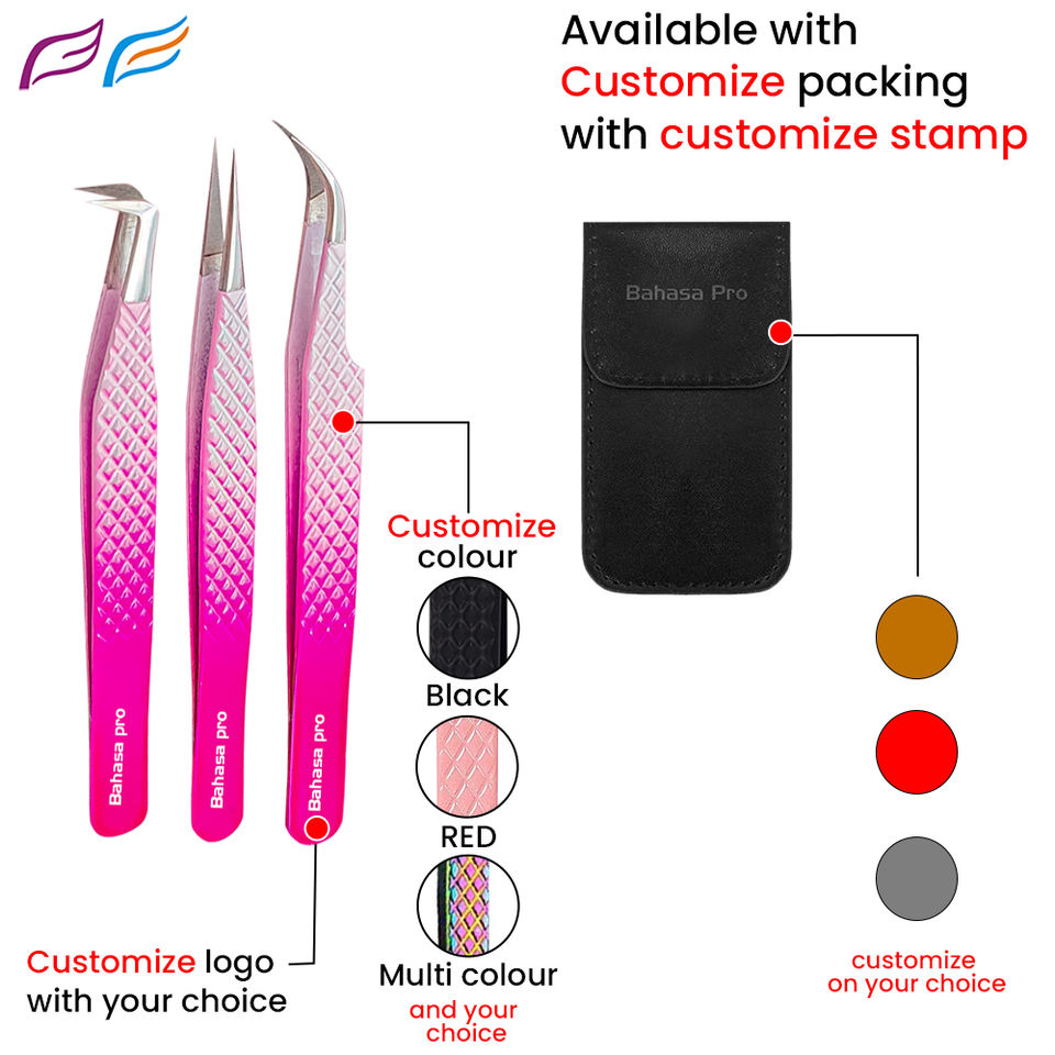 Bahasa Pro Custom Pink Lash Tweezers Steel Eyelash Extension Tweezers with Custom Brand Name Volume and Fiber Tips