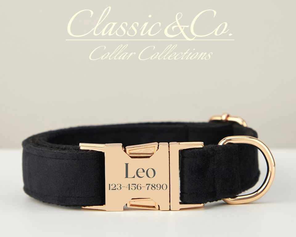 Balck Veet Personalize Dog Collar Leash Set With Flower & Bow Tie For Male Female Pet,Gold Engraved Name Tag,Wedding Puppy Gift