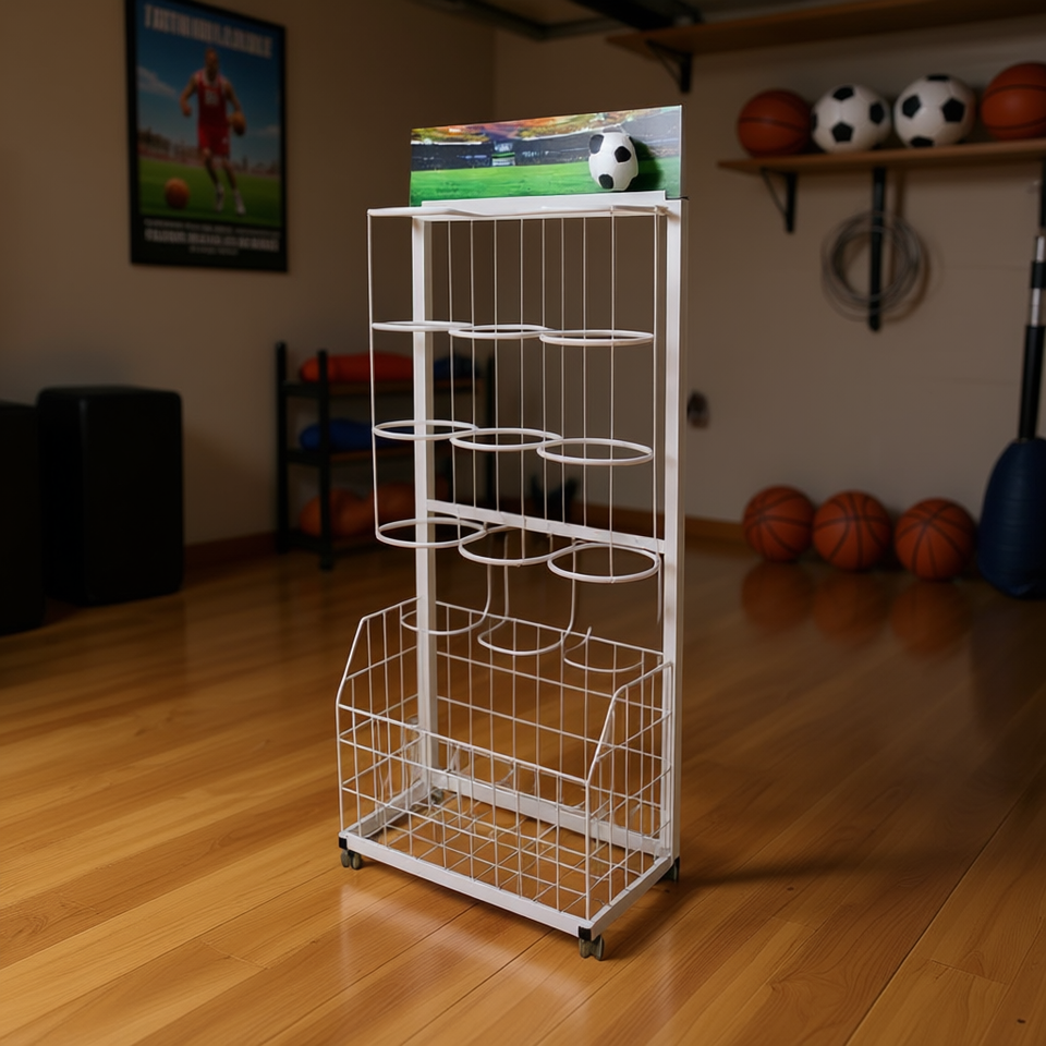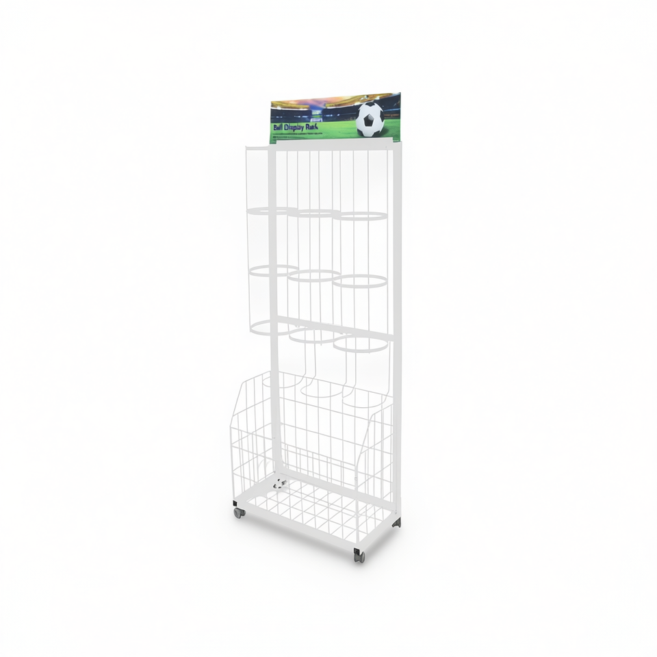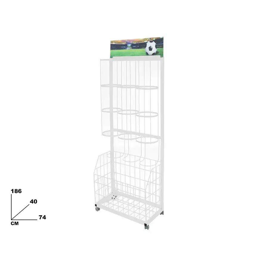 Ball Display Rack 186cm White Metal Wire Shelf With Wheels For Sports Equipment Storage