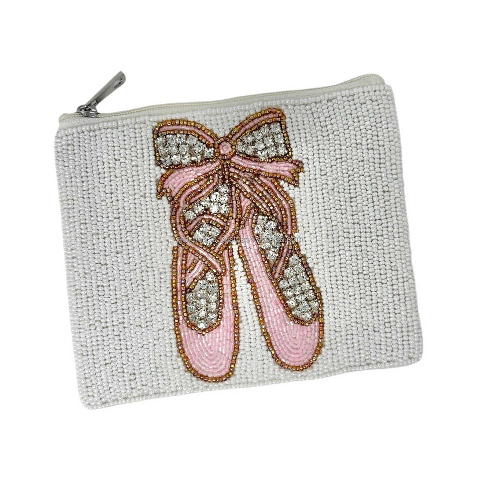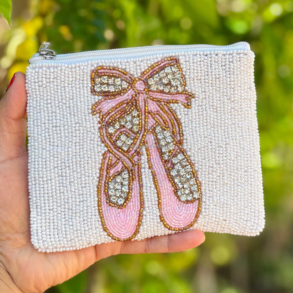 Ballet Shoes Beaded Coin Purse Handmade Creative Zipper Closure Multicolor Dance Bag Bow Design Crystal Bead Pouch Clutch Unisex