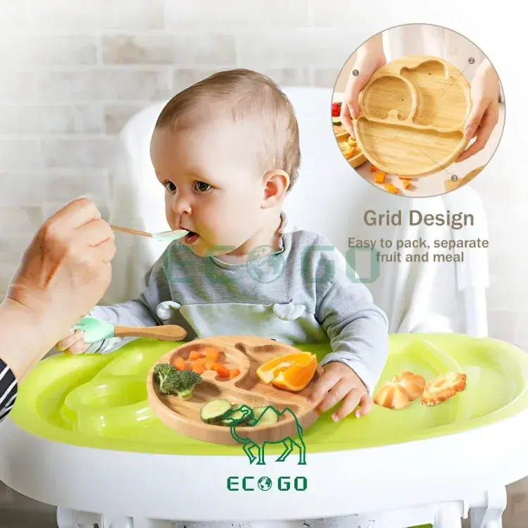 Bamboo Baby Serving Tray Food Platter with Suction Bottom Wood Divided Suction Toddler Food Plate Weaning Plate Feeding Set