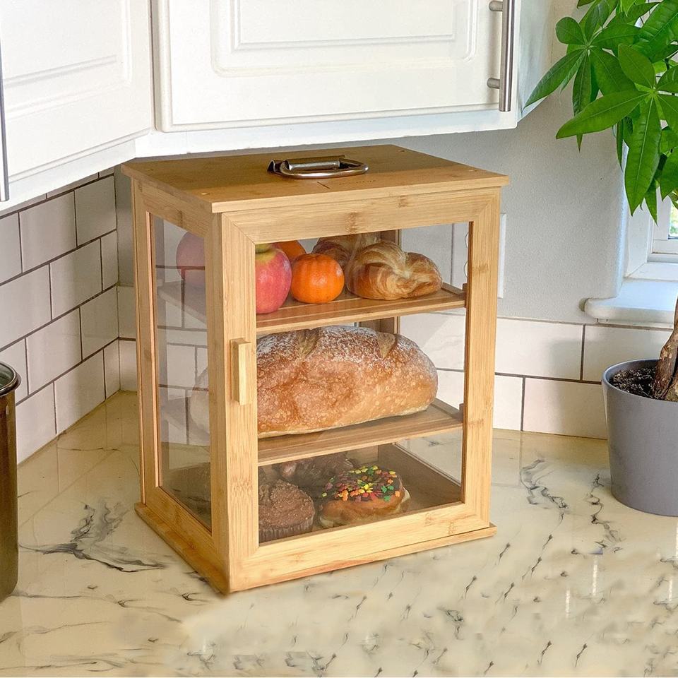 Bamboo Bread Box With All Clear Windows and Adjustable Shelves Bamboo Organizerfor Kitchen Countertop