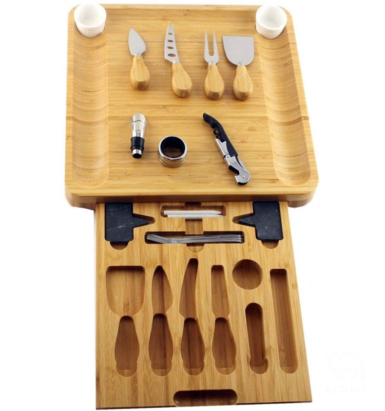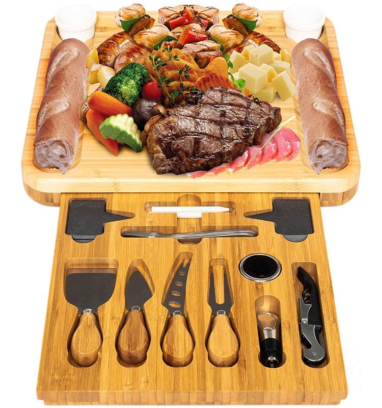 Bamboo Cheese Board and Knife Set, Wood Charcuterie Platter Serving Meat & Cheese Board with Slide-Out Drawer