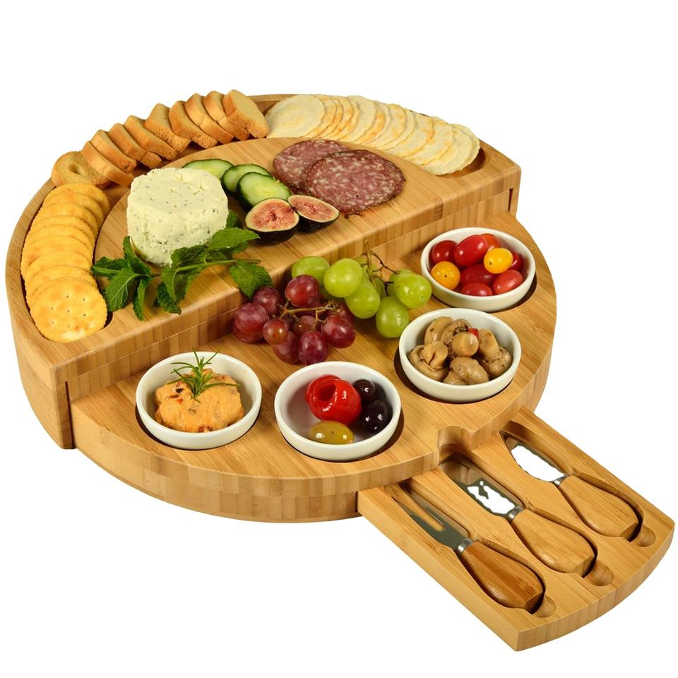 Bamboo Cheese Charcuterie Board With Knife Sauce Dish Set Wood Round Cheese Board for Home Party Gift