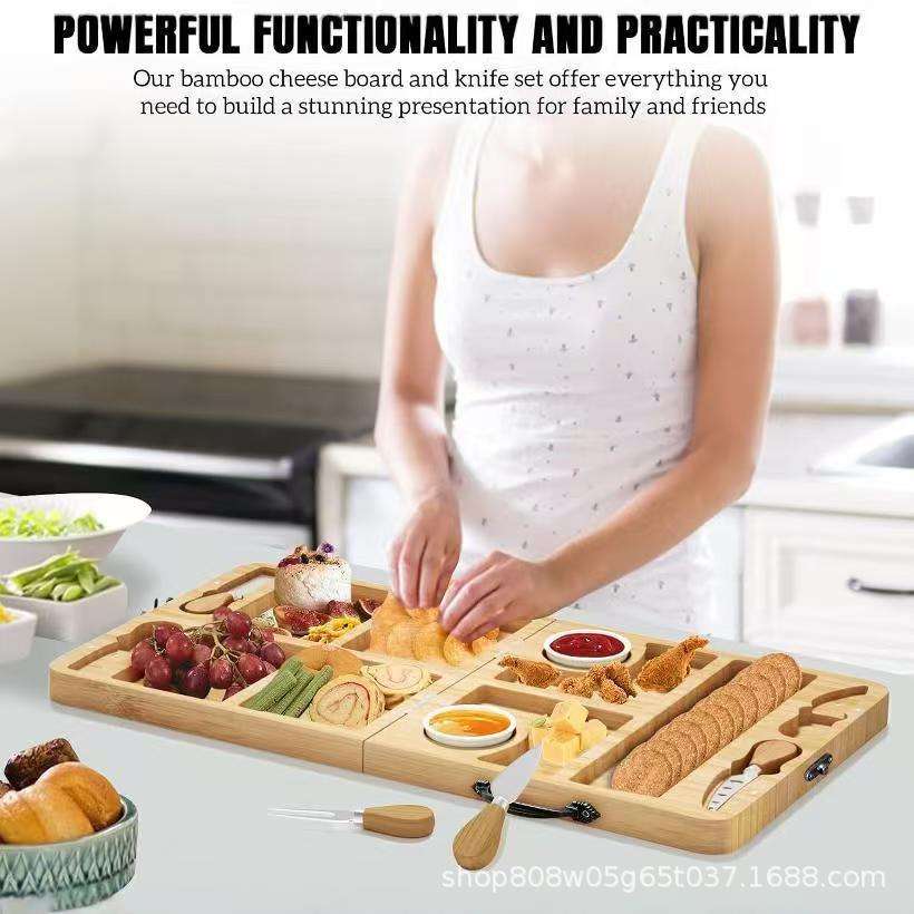 Bamboo Foldable Cheese Board 11.42x22.83 In Magnetic Knife Holder Portable Serving Tray With Dividers For Snacks And Nuts