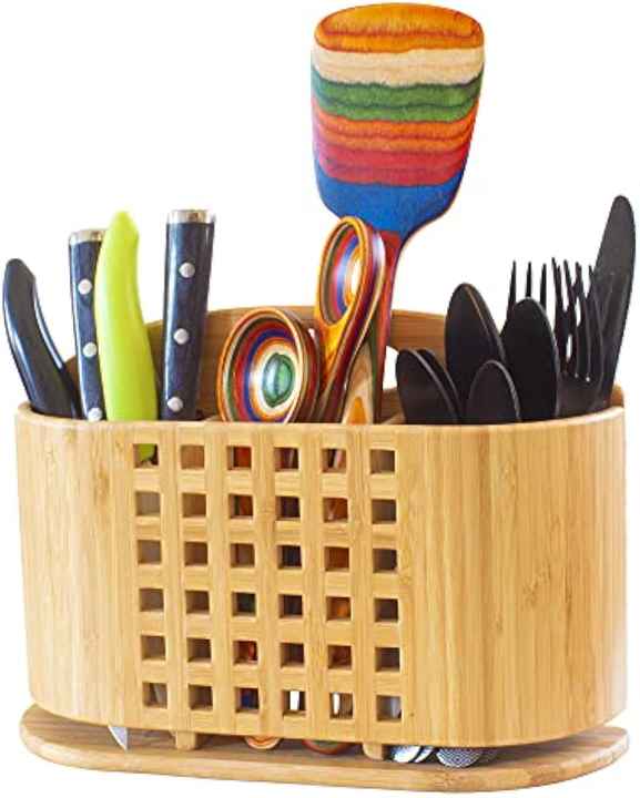 Bamboo Modern Utensil Drying Caddy Stand for Eco Dish Drying Rack Flatware Cutlery Organizer