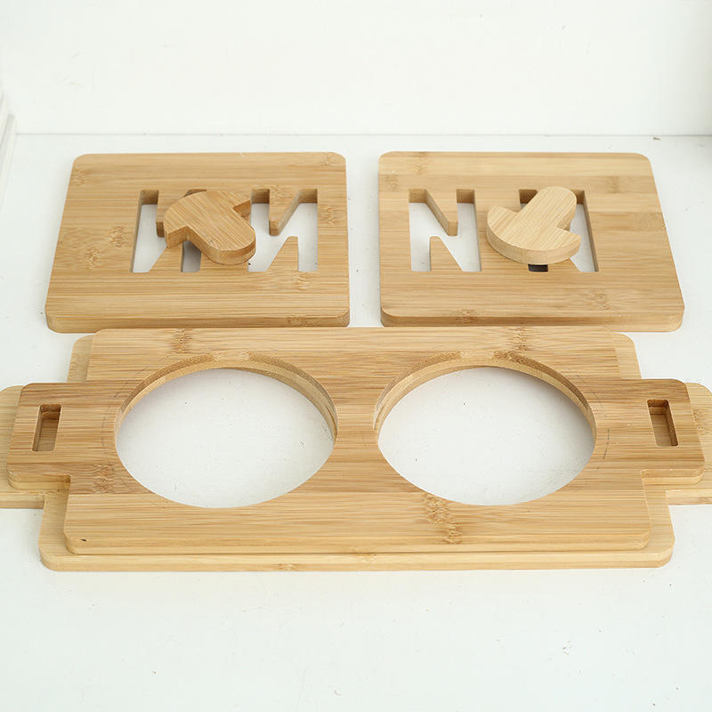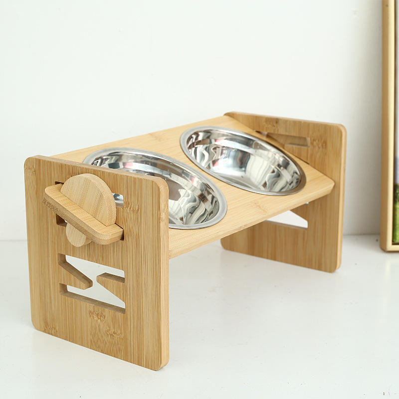 Bamboo Pet Bowl Stand Dual Feeding Tray Adjustable Quadrate Shape for Cats Dogs Small Medium Pets Simple Design Letter Print