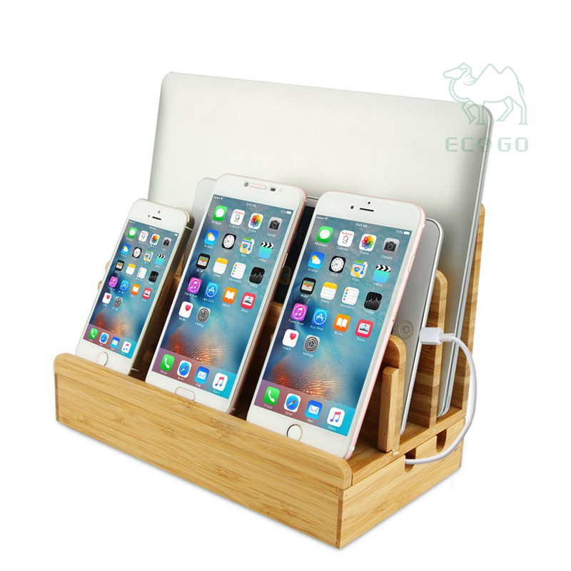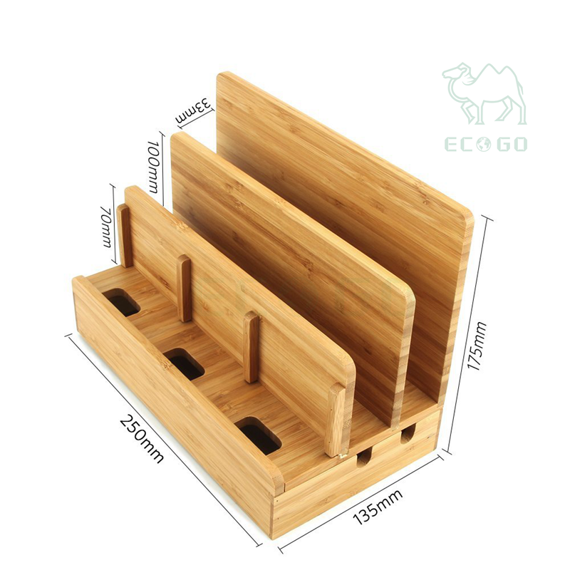 Bamboo Wood Desktop Cord Organizer Dock Station Tablet Stand Holder with 3 Slots for Phone Charging Storage Shelves & Units