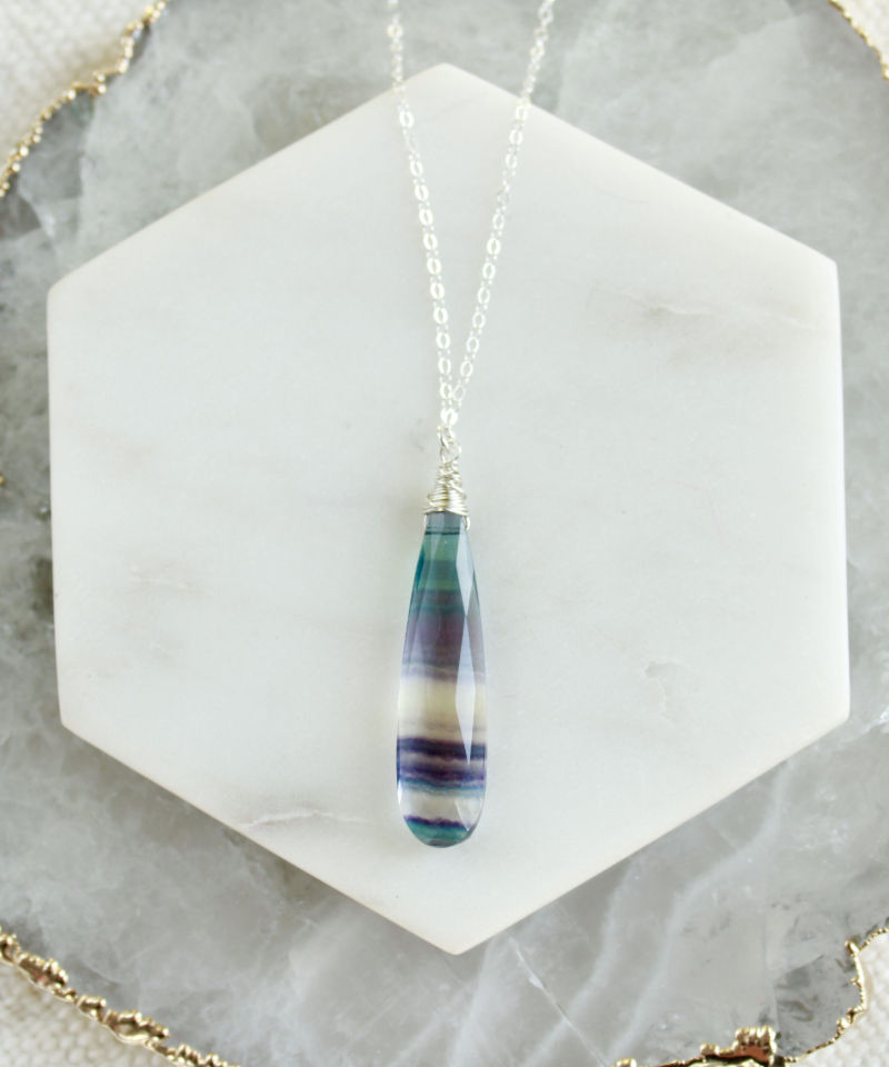 Banded Fluorite pear gemstone wired chain necklace Bohemian 925 sterling silver gold plated handmade pendant necklaces for women