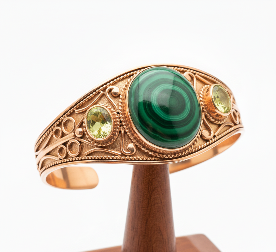 Rudra Gems Bangle Bohemian Style Rose Gold Tibetan Silver Men's Beaded Bracelet Handcrafted Natural Malachite Cabochon High