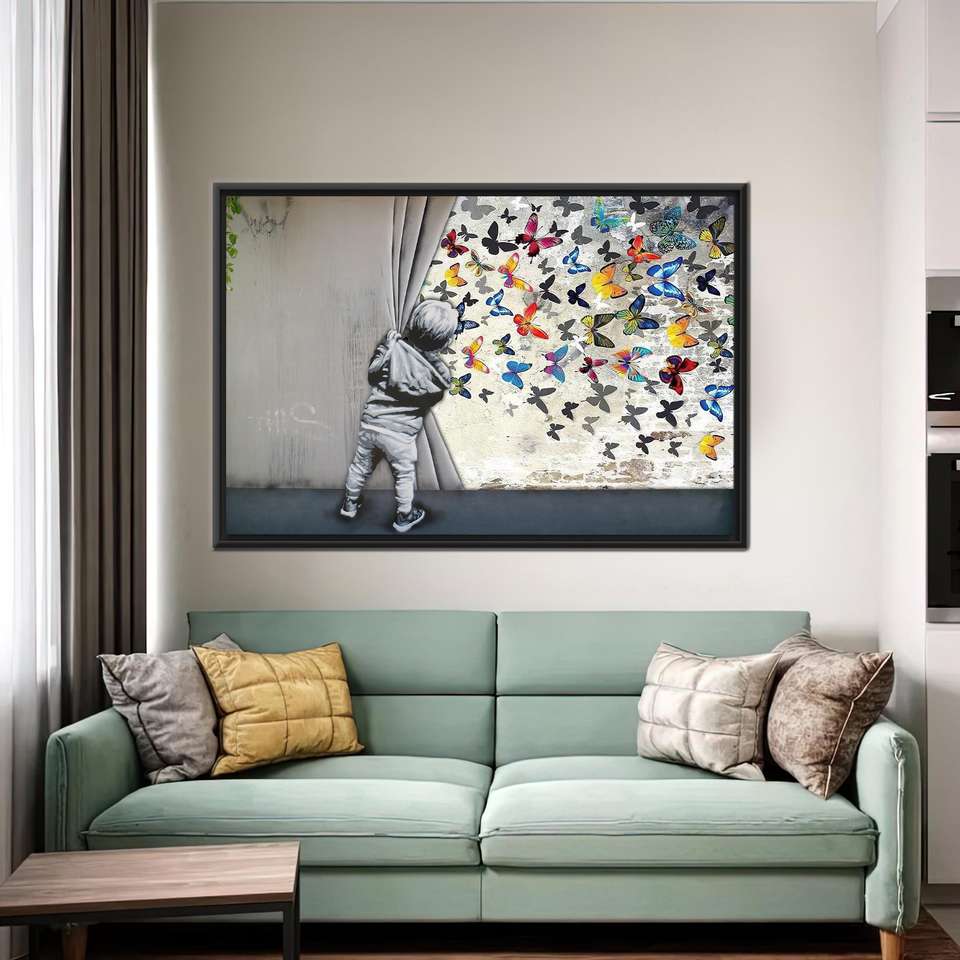 Banksy Butterfly Canvas - Printed Artwork, Large, Wall Decor,1P:Black Framed