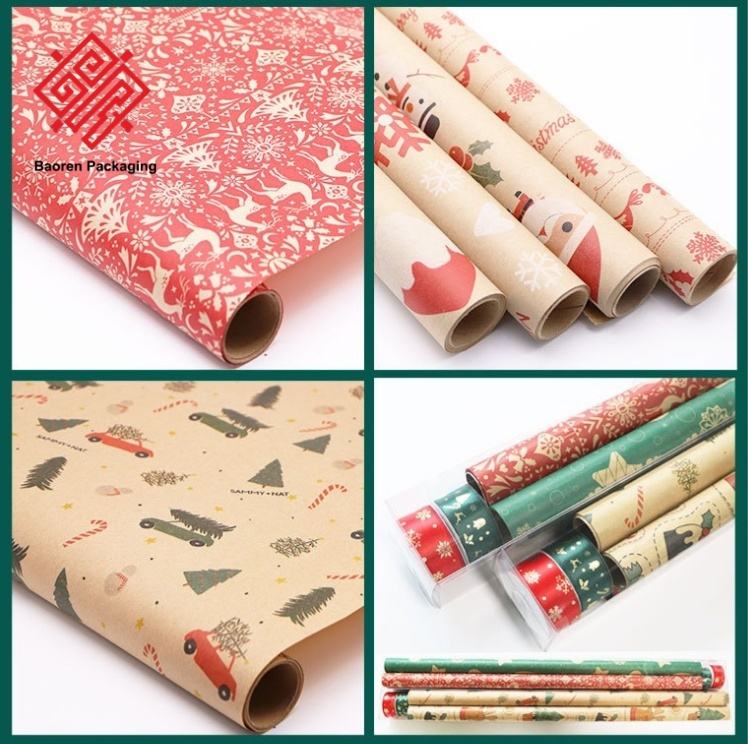 Baoren Factory Direct Rolled Kraft Paper Custom Logo Printing Thick Christmas Gift Wrapping Paper with Custom Logo Printing