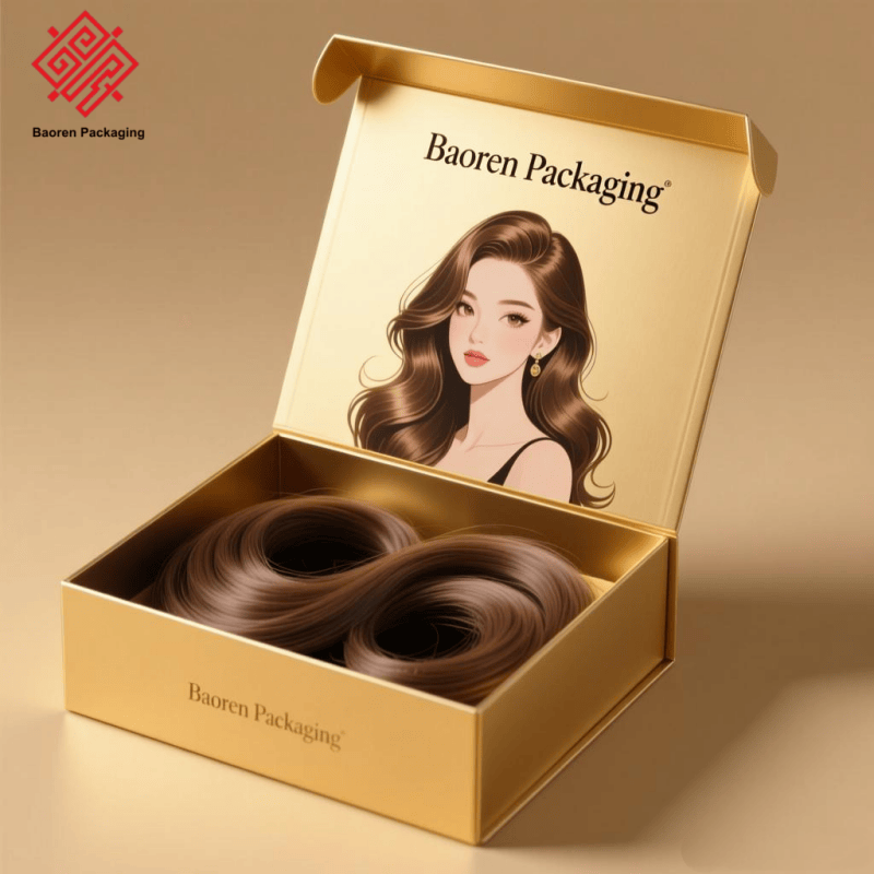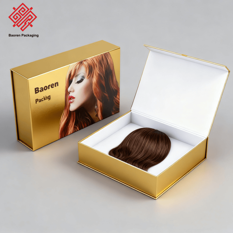 Baoren Recycled Travel Size Gold Color Cardboard Hair Box With Sponge Liner Foldable Unique Wig Packaging Boxes With Silk Satin