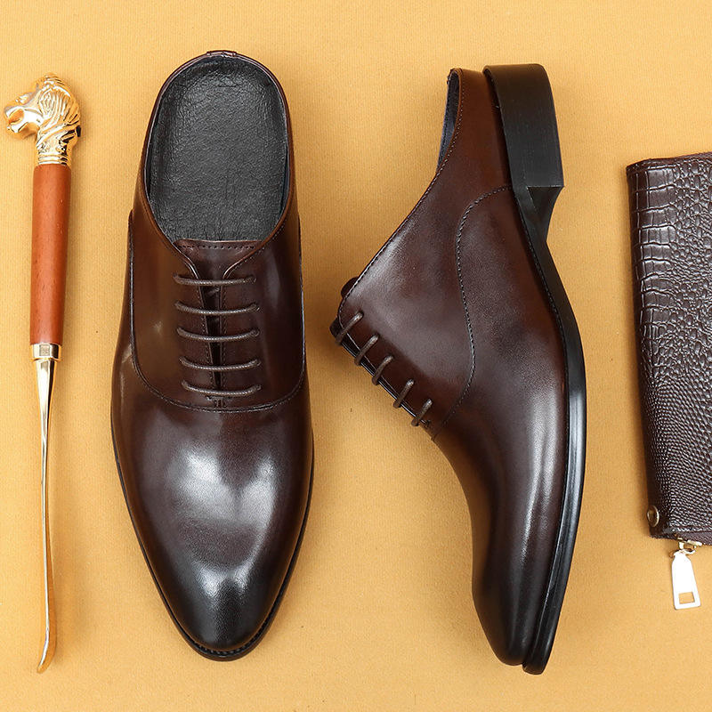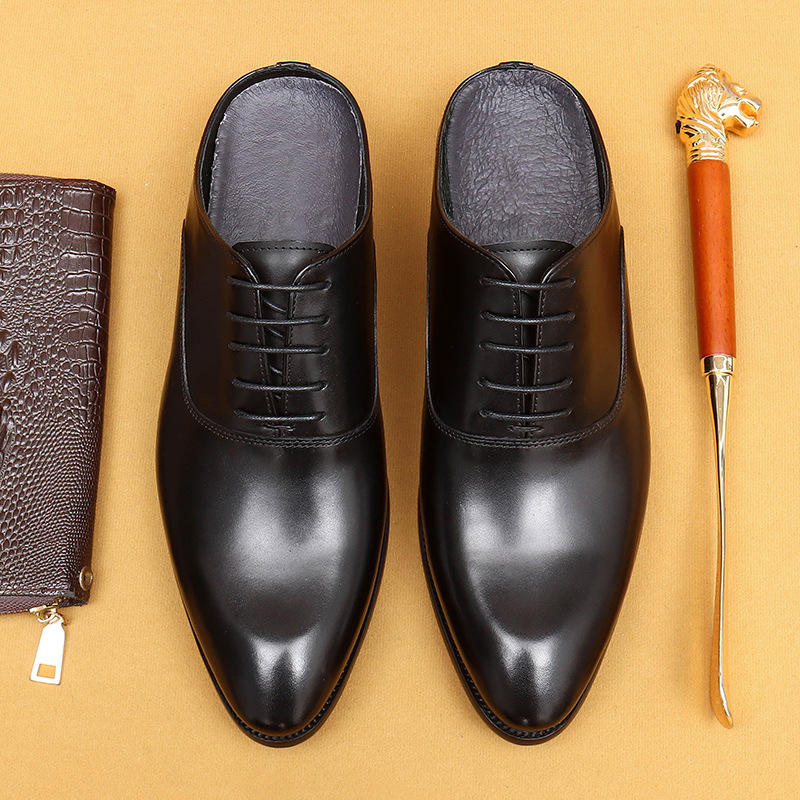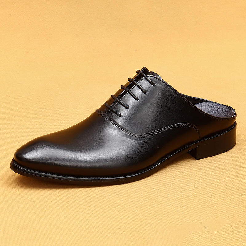 Baotou slip-on men's genuine leather lazy summer outerwear pointed-toe shoes casual half-heel slippers