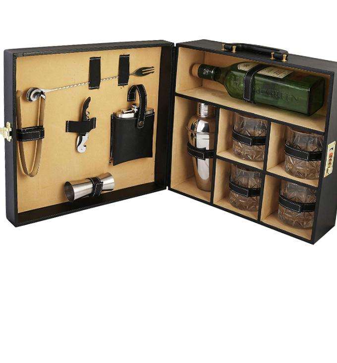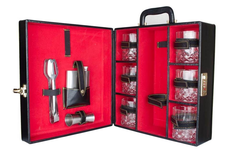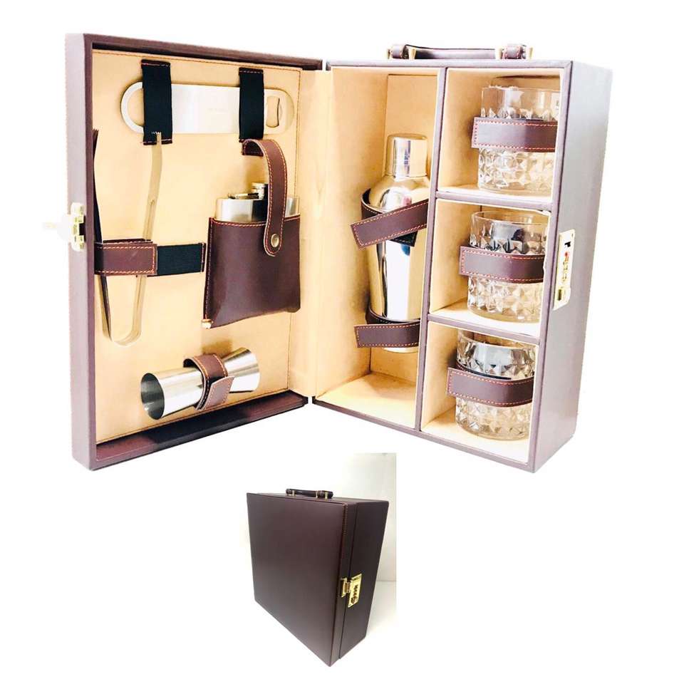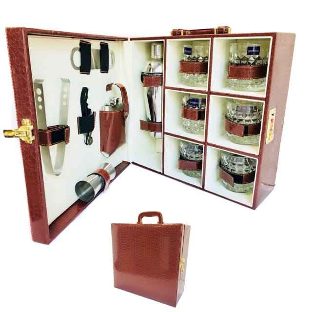 Steel cocktail sekhar with 6 Glass Leather Portable Bar Set
