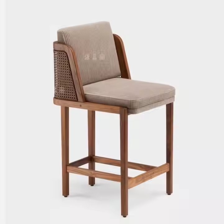 Bar chair made of solid teak wood frame with woven rattan on the backrest and include cushion for indoor and outdoor use