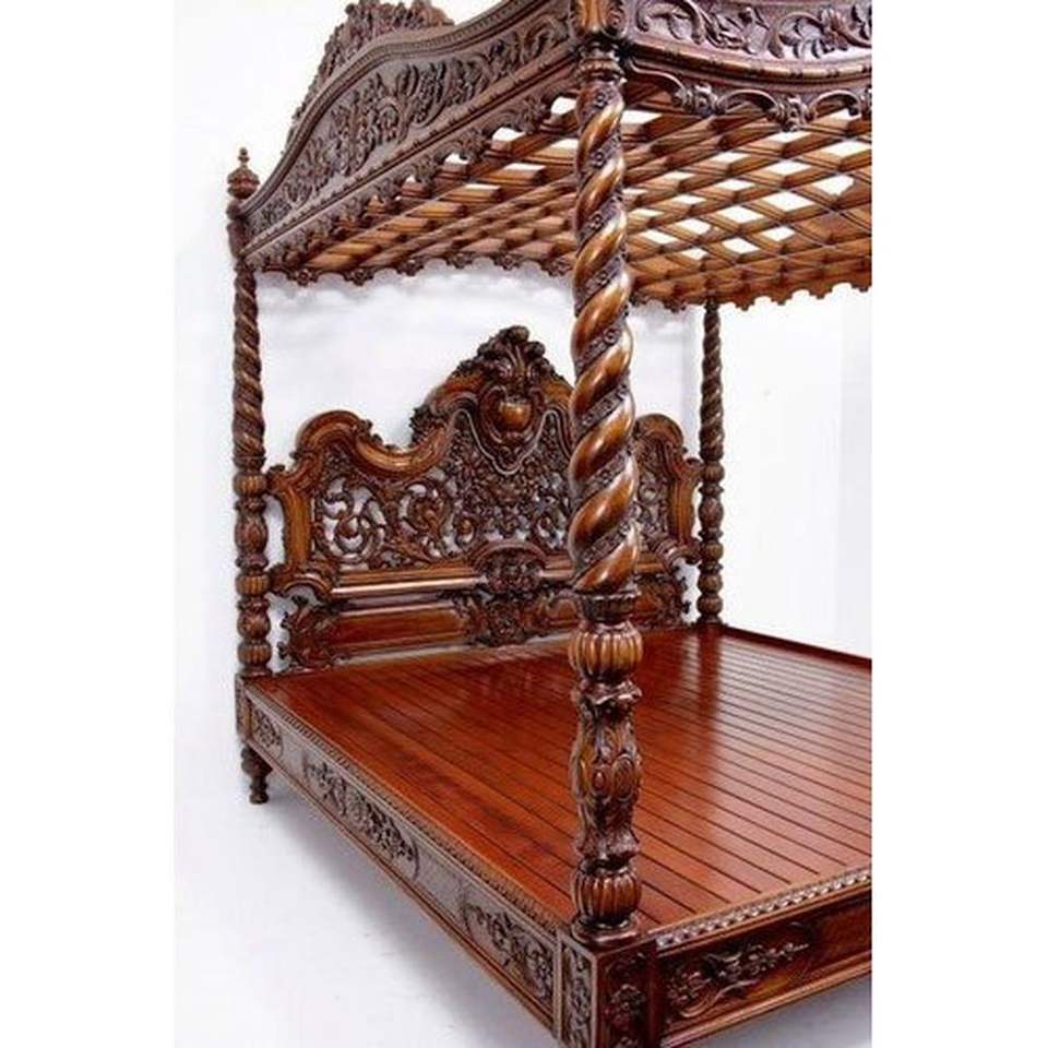 European Baroque Style Solid Mahogany Wood Hand Carved Bed with Canopy