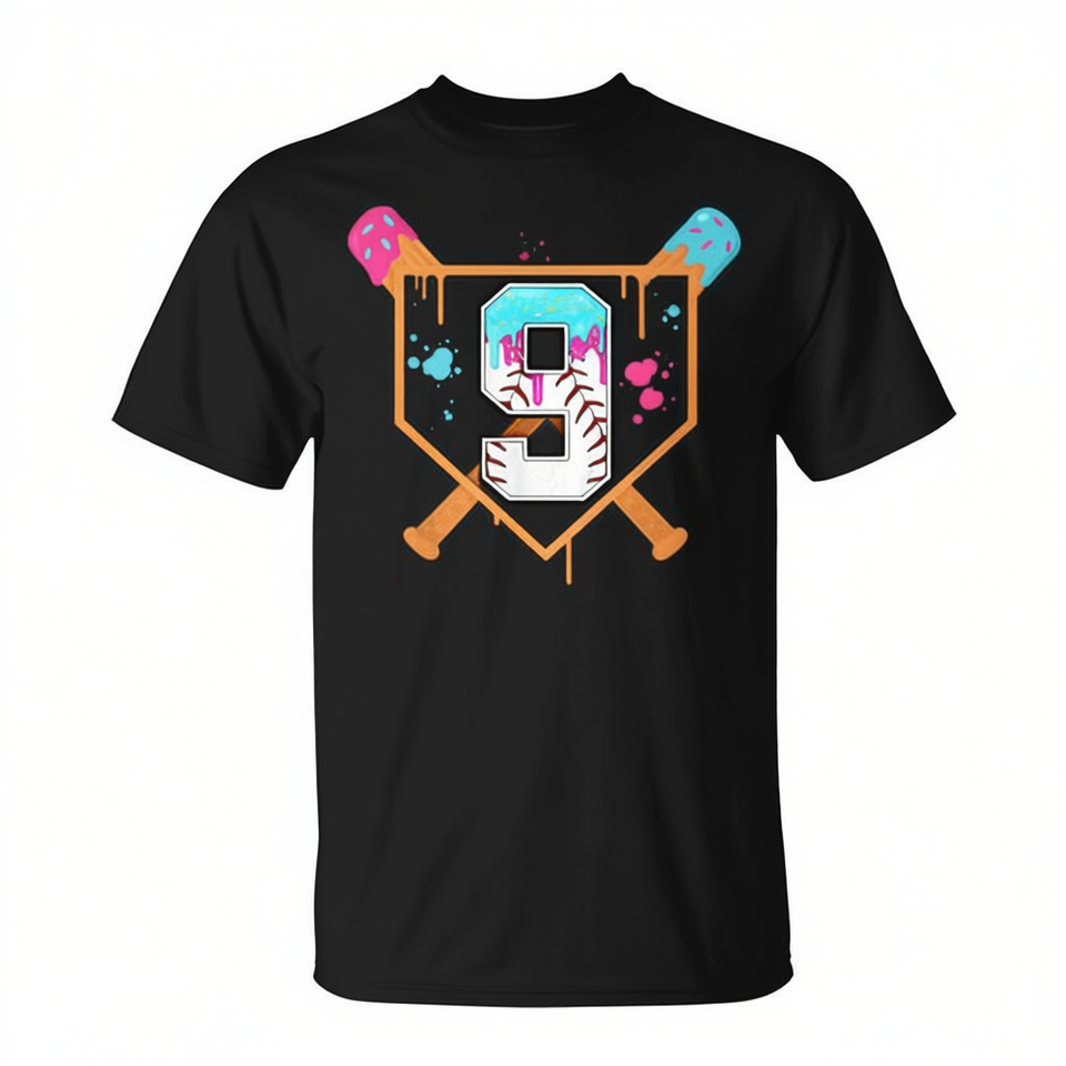 Baseball 9Th Birthday Ice Cream Drip T-Shirt For 9 Year Old Boy Birthday Gift Short Sleeve Crew Neck Digital Printing Children