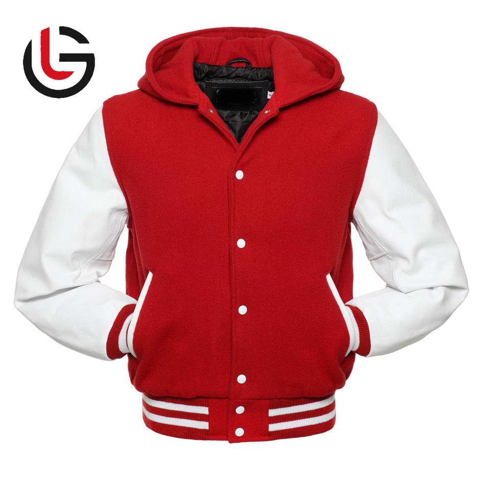 Baseball College Student Varsity Jacket Winter Letterman with Red Wool Body and White Leather Sleeve Jacket For Men With Hood