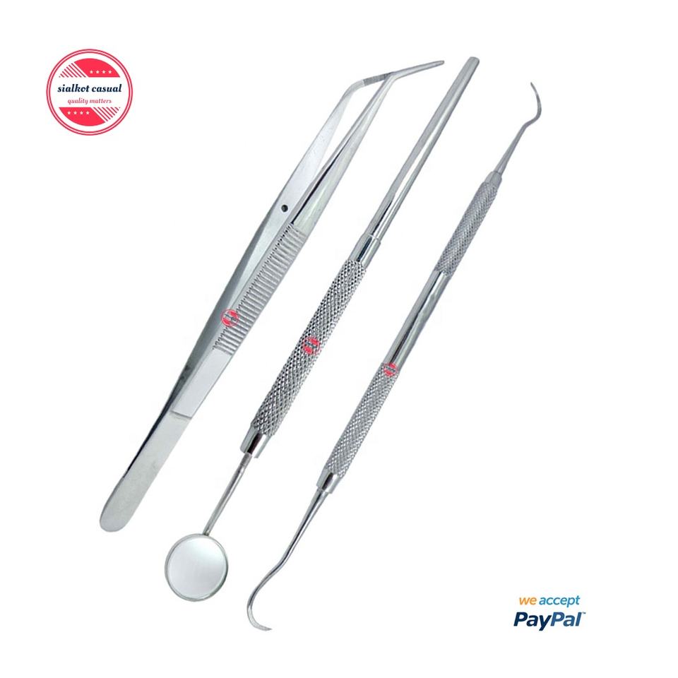 Basic Diagnostic Dental Examination 3 Pcs Set Stainless Steel Dental Sickle Scaler, College Tweezer, Mouth Mirror with Handle