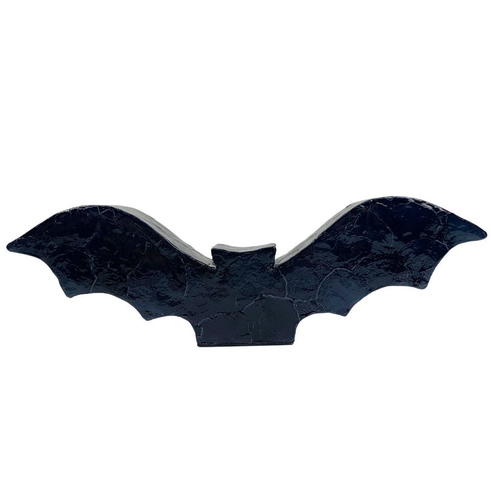 Bat Shape MDF Sculpture with Black Capiz Inlay, Handmade Halloween Flying Animal Figurine for Home Decor and Party Display