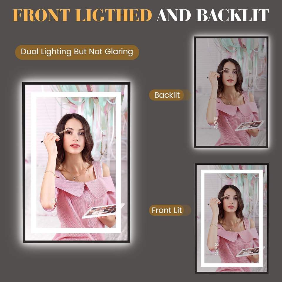 Bathroom Mirror,24"x36" with Black Frame, Front Light and Backlit, Stepless Dimmable, Anti-Fog, Shatter-Proof, Memory, 3