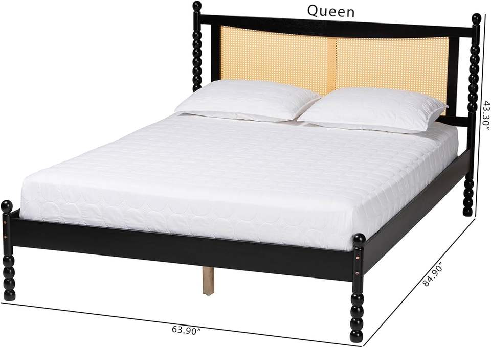 Baxton Studio Okena Queen Size Platform Bed Traditional Design Solid Pine Wood Woven Rattan Durable Bed Frame