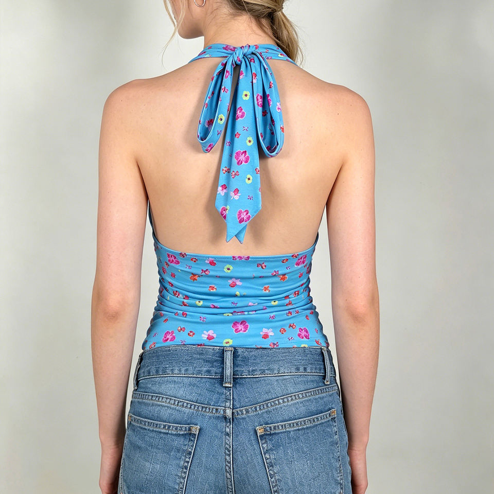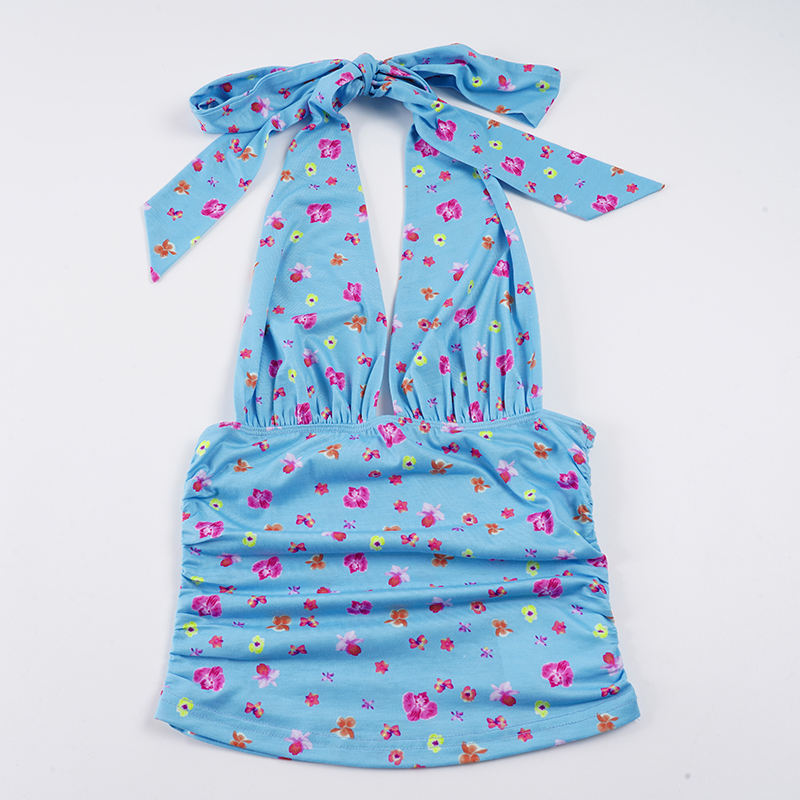 Beach Holiday Floral Print Ruched V Neck Bustier Halter Tie Back Top Hot Girl Sexy Beach Versatile Open Back Sleeveless Top