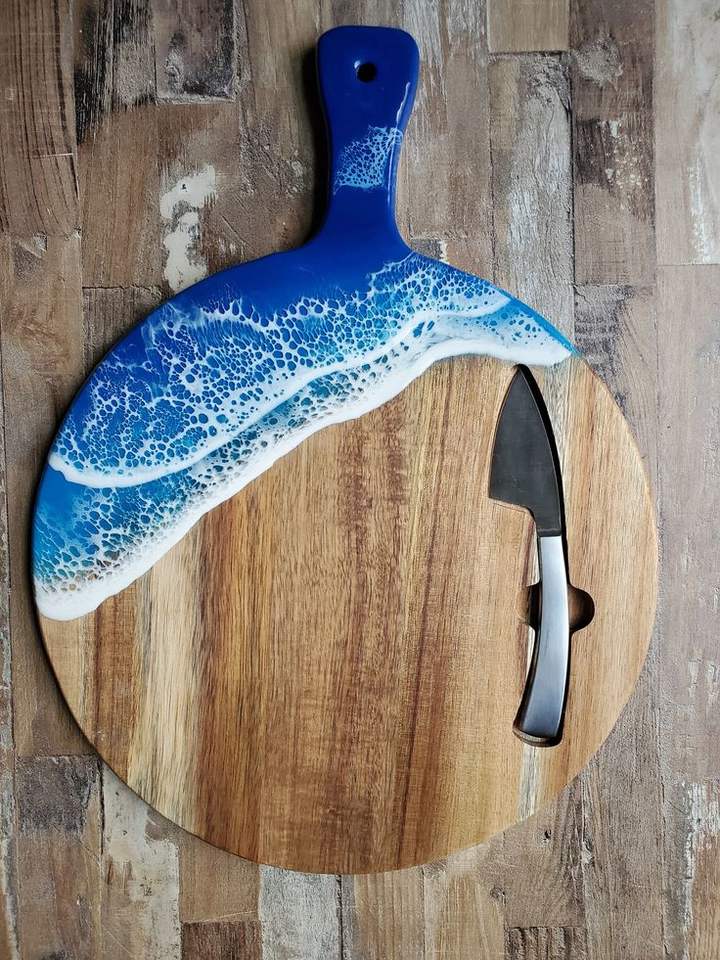 Beach Style Round Shape Wooden Resin Cutting Board and Chopping Board with Handle for Pizza Platter with Multi Color