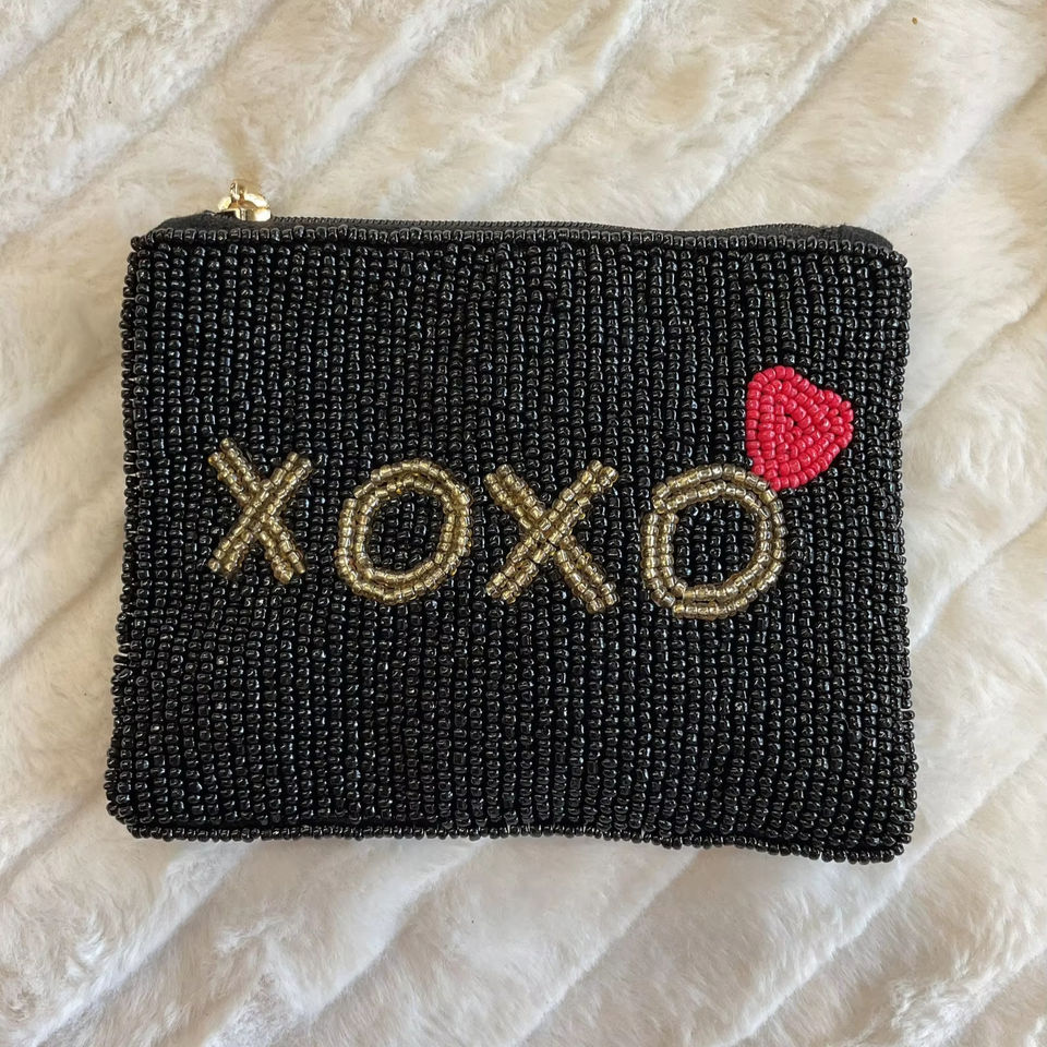 Beaded Coin Purse XOXO Heart Design Black Seed Beads Zipper Clutch Mini Wallet Handmade Cute Gift for Women Girls Trendy Pouch