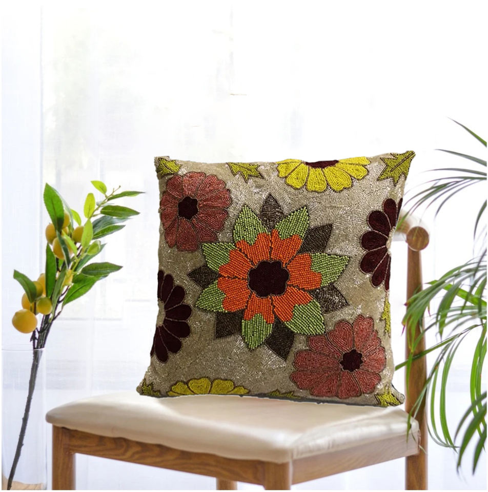 Floral Design Beaded Cushion Cover Multi-Color Beads Work Leaf Pattern for Home Living Room Couch Decoration Discounted Price