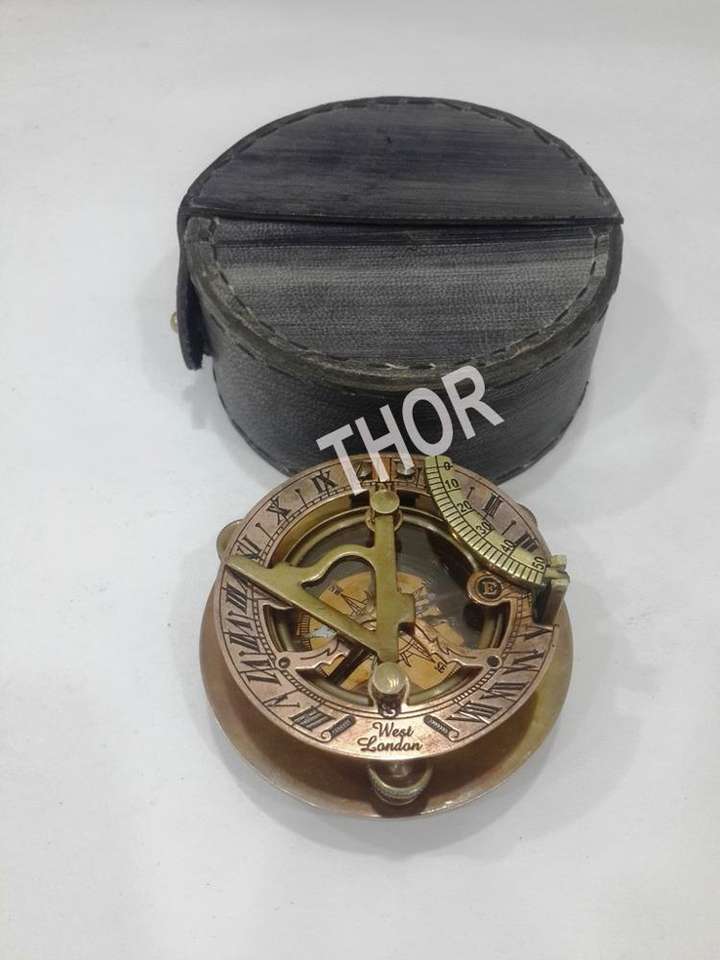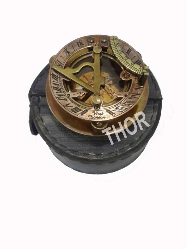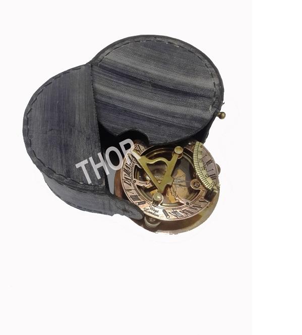 Antique Black Leather Box Encased 2.5\" Brass Sundial Compass Digital Dial Display Beautiful Navigation Equipment for Hiking