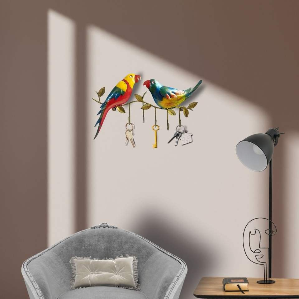 Beautiful 2 Parrots on a Branch Key Hanger Excellent Quality 5 Hooks for Wall Mount Storage for Diwali Occasions