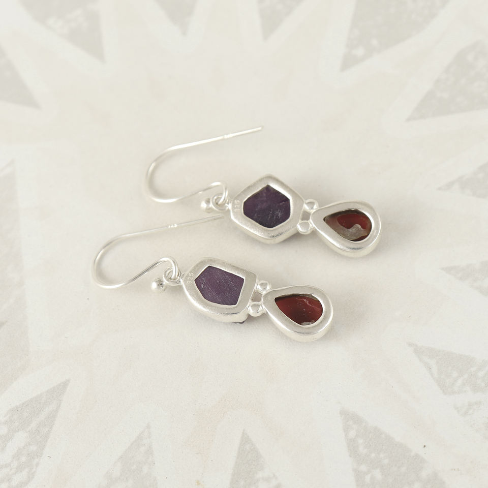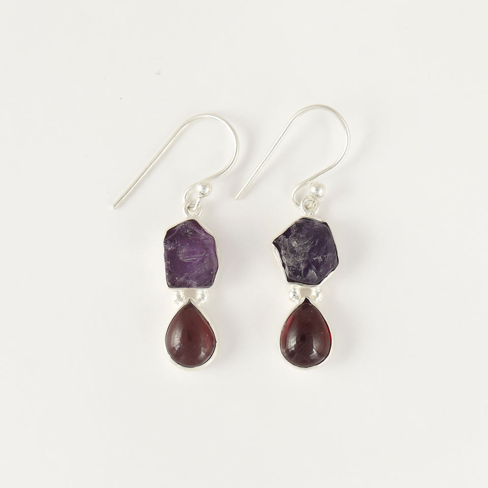 Beautiful 925 Sterling Silver Multi-Gemstone Drop Earrings Handmade Natural Garnet & Raw Amethyst For Parties & Bridal Jewelry