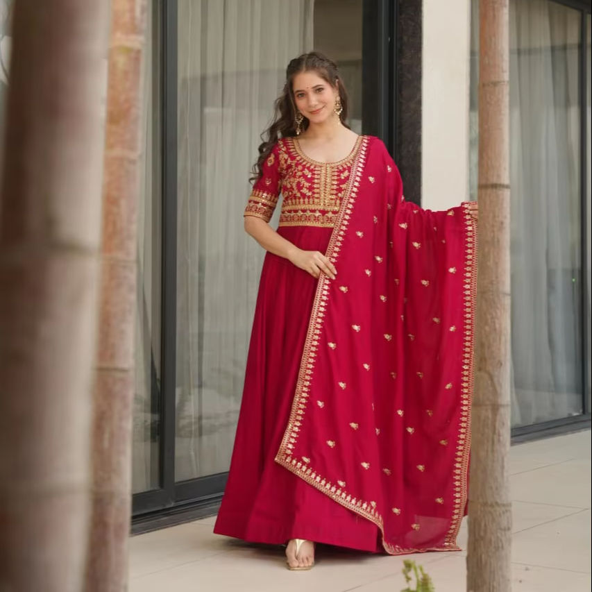 Beautiful Designer Women Gown with Heavy Dupatta Long Indian Function Pakistani Silk Kurti for Adults