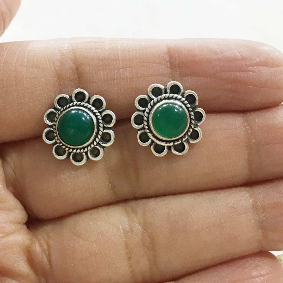 Beautiful Floral Design Green Onyx Gemstone Sterling Silver Earrings Jewelry Wholesale Online 925 Silver Round Gemstone Earrings