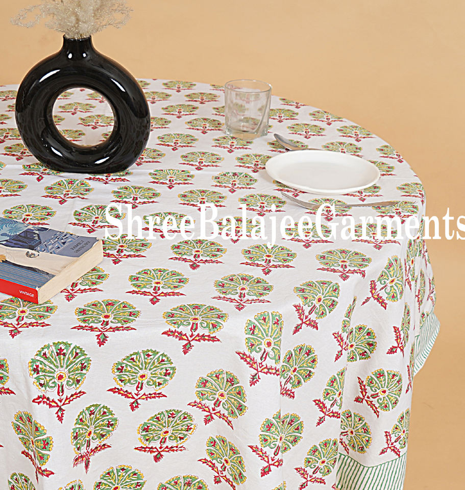 Beautiful Floral Design Pure Cotton Tablecloth Handmade Block Printed for Indoors Outdoors Farmhouse Style for Party Table
