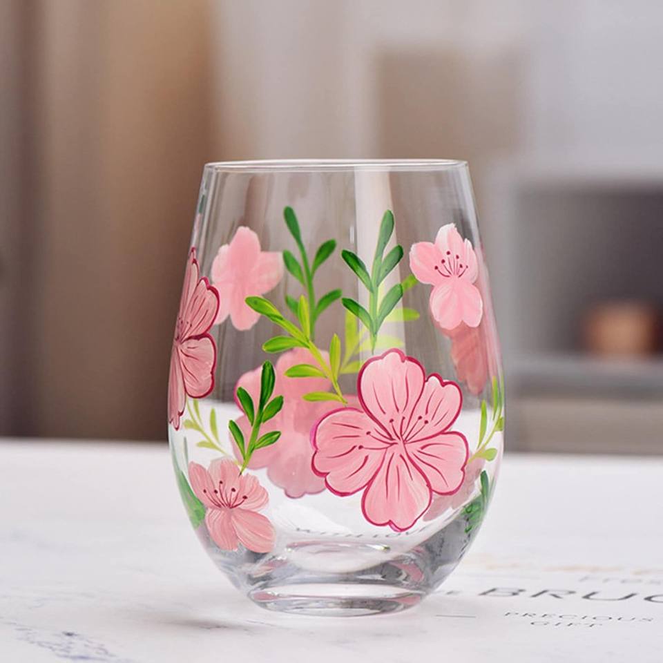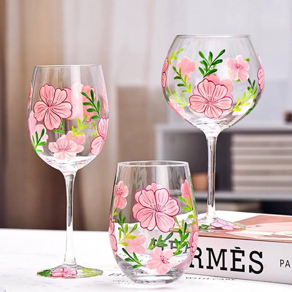 Beautiful Floral Painted Wine Glasses Set Of Two Blown Wine Glasses For Cocktail Party
