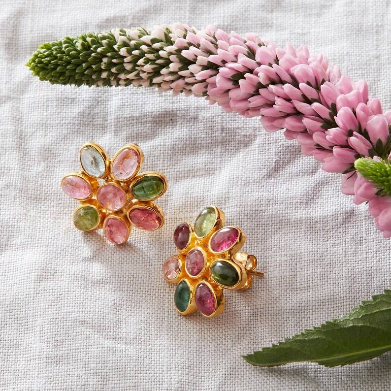 Beautiful Genuine Watermelon Tourmaline Faceted Gemstone 18K Gold Plated 925 Sterling Silver Flower Stud Wedding Party Gift