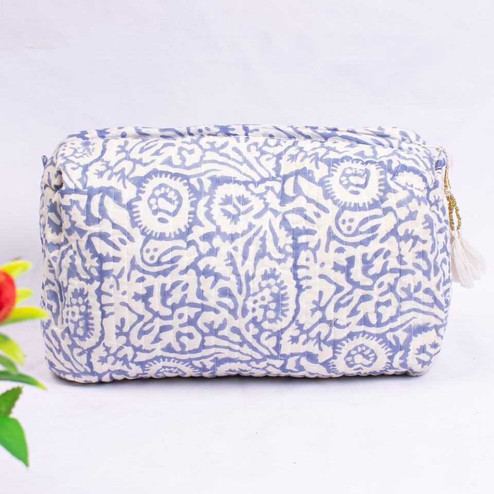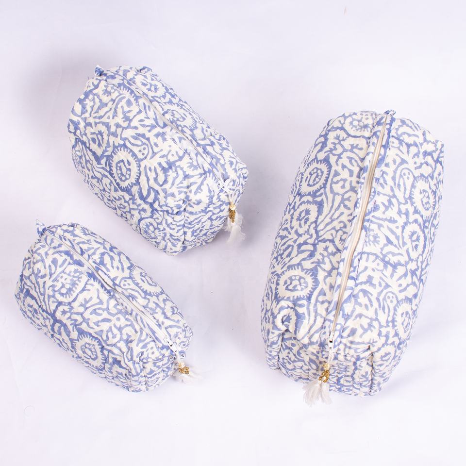 Beautiful Indian Sanganeri Block Printed Cotton Makeup Bag Set of 3 Quilted White Woman Personal Toiletry Wash Bag Wholesale