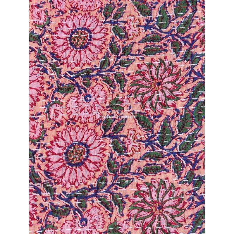 Beautiful Peach Indian Handmade Print Floral Cotton Kantha Quilt King Bedspread Stunning Border Design Wholesale Bedding Set