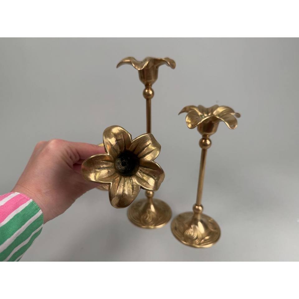 Beautiful Set of 3 Art Nouveau Flower Brass Candlestick Holders Vintage Floral Jugendstil Solid Brass Taper Candleholders