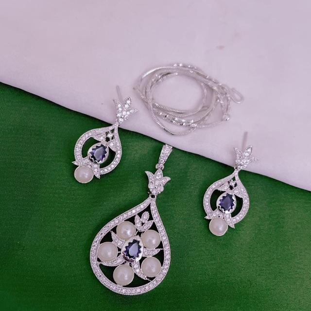 Beautiful Silver Finish Designer Pendent Set with Earrings With AD Stones Look for Wedding Parties Wear Collection For Women