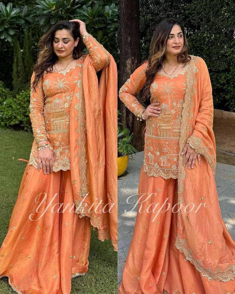 Product Name:Chinon Silk Top Sharara Palazzo And Dupatta Set