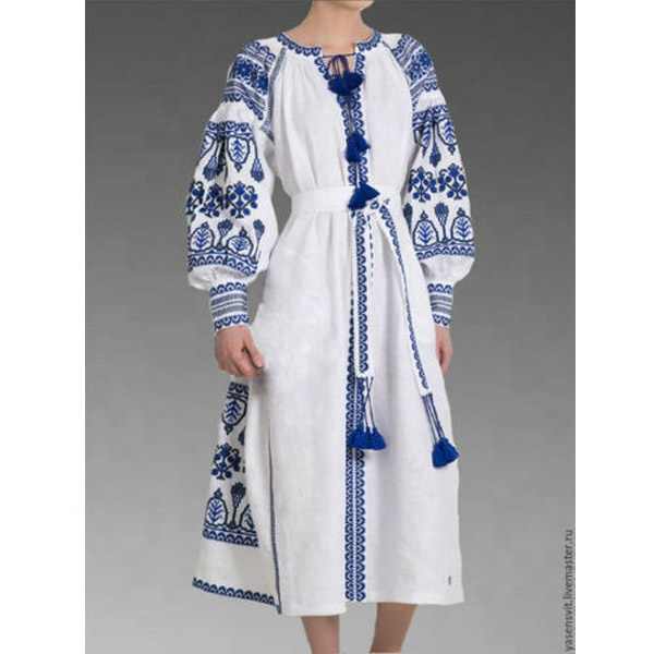 Beautiful Spring & Summer Cotton Embroidered White Blue Contrast Boho Style Ukrainian Folk Dress Tassel Decorated Shirt Dress