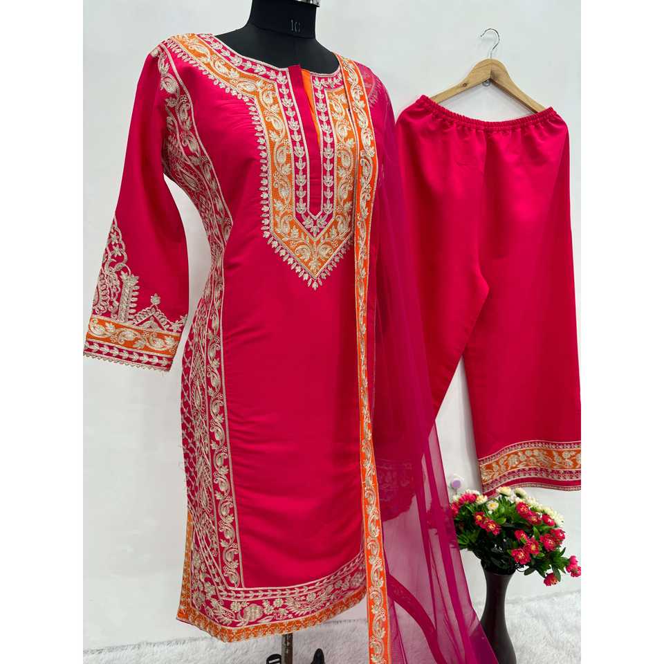 Beautiful Top Plazzo Dupatta Set with Chine Stitch Work for Parties and Prom Dresses