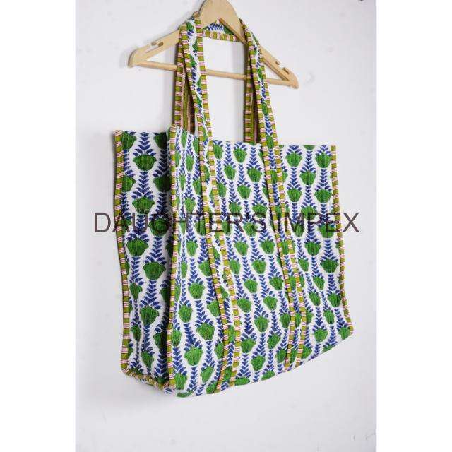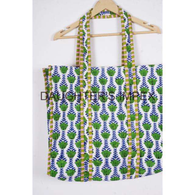 Lady Vintage Tote Bag Beautiful Bohemian Striped Green Floral Cotton Hand Block Quilted Top Handle Open Two Handle Design Flower