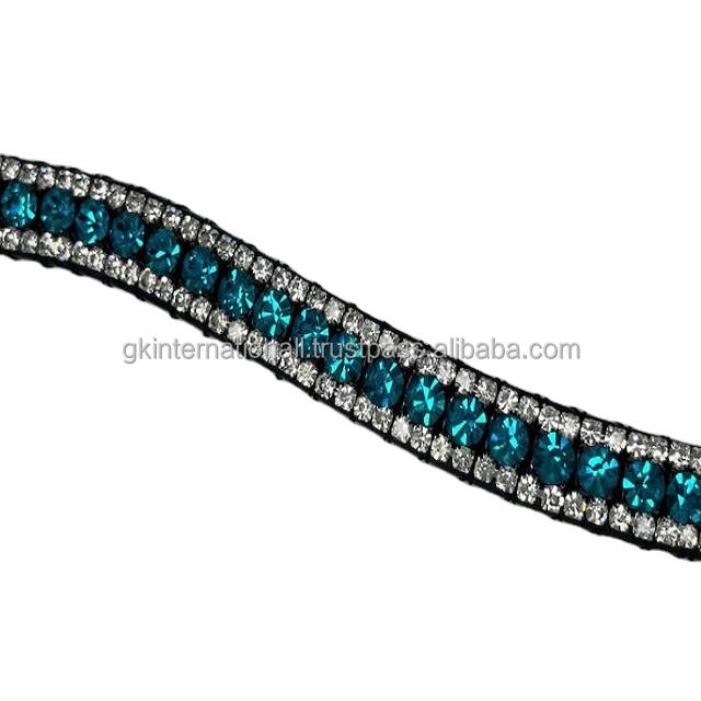 Beautiful Handmade Blue Green Diamante Crystals Rhinestones Bling Padded Black Leather Horse Brow Band with Stitched Loop Ends